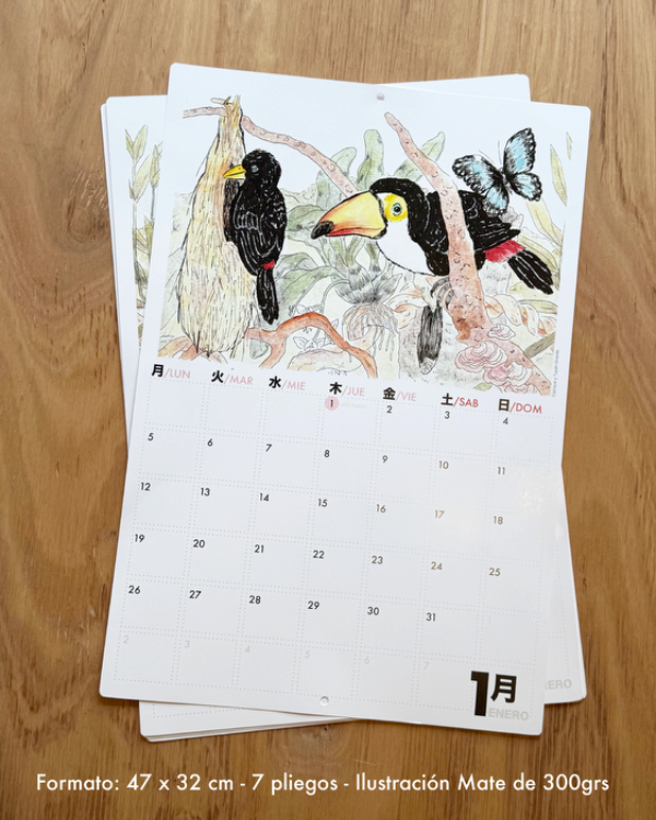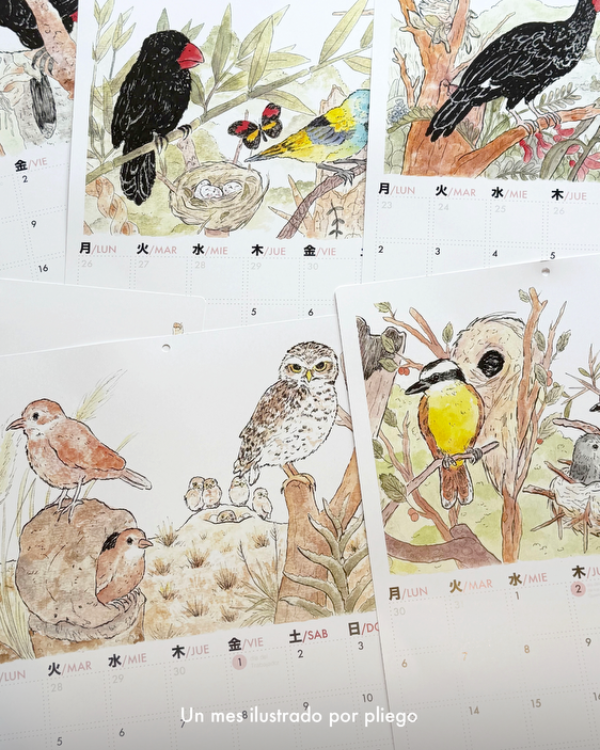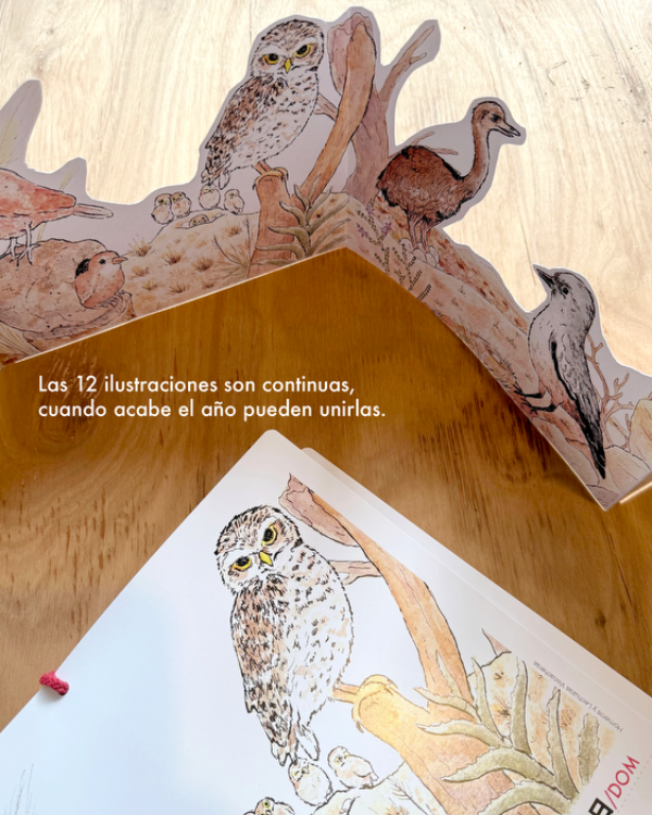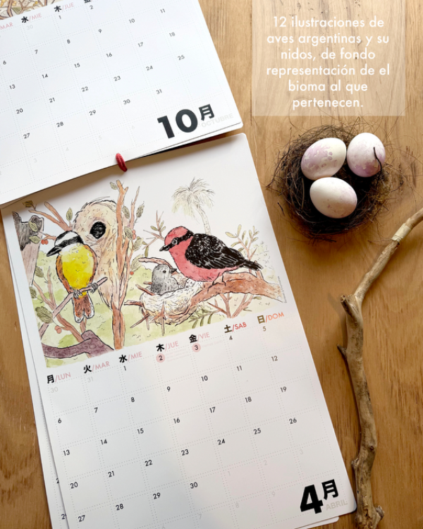 Este calendario de pared ilustrado con aves de Argentina, sus nidos y el bioma al que pertenecen.